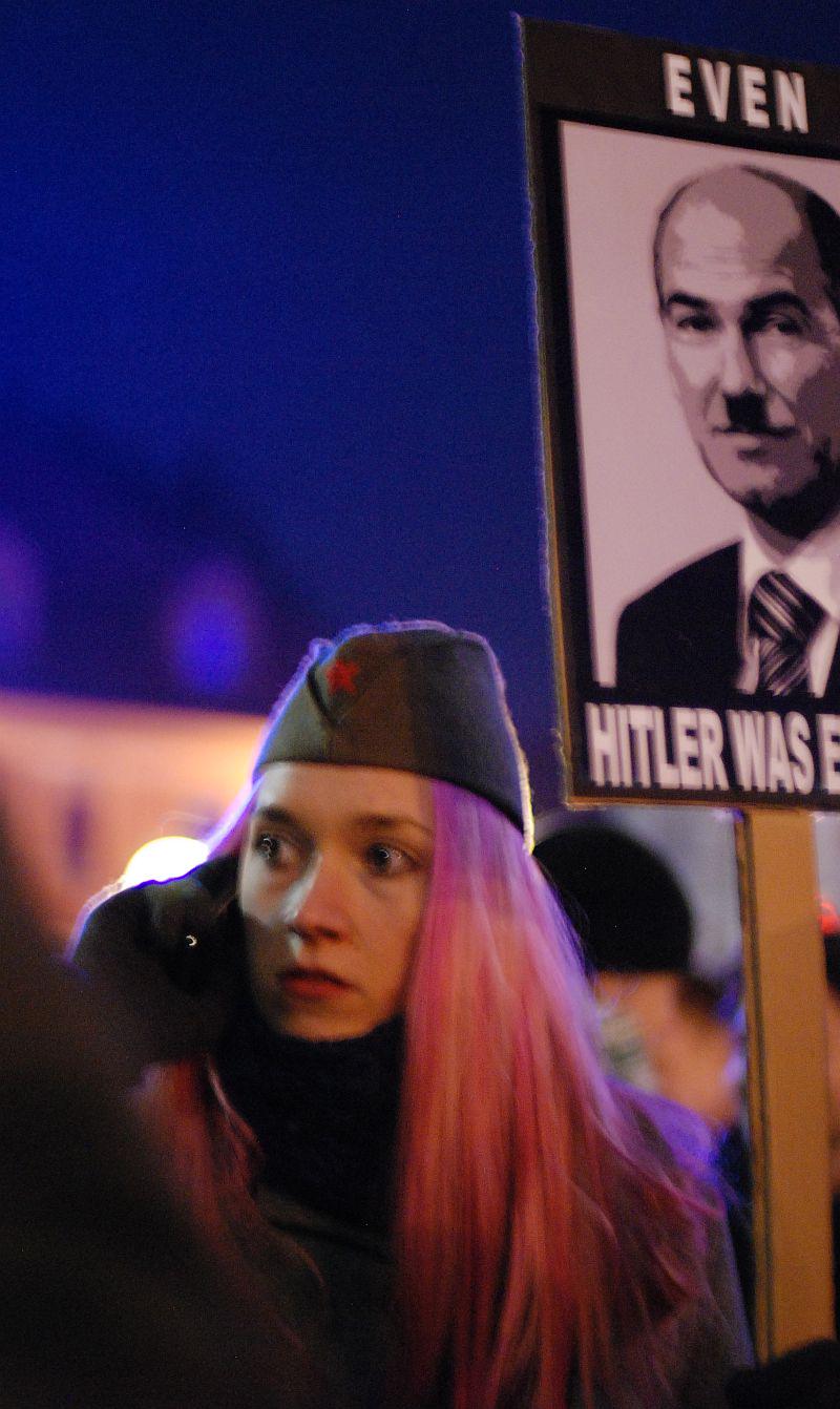 Mlada revolucionarka/anti-kapitalistka na sliki si nekaj tišči k ušesu - žal se ne vidi, ali je iPhone 4S ali iPhone 5...