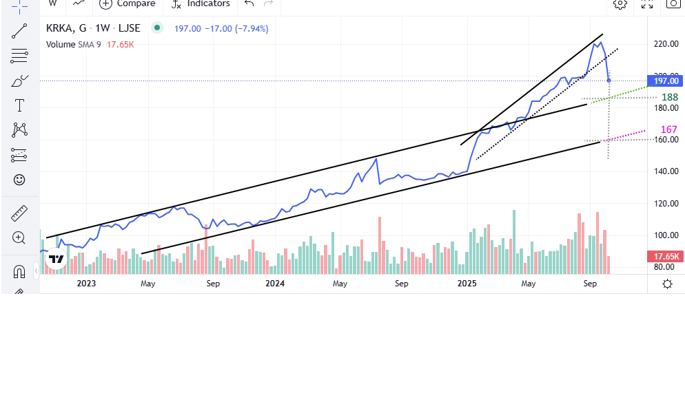 Večji del delnic je lepo rastel v tem letu, zlasti Krka, ki je danes omenjena, pa je bila do novega leta (torej do letošnjega januarja) po tehnični analizi v trendu rasti več let in če gledam kanal min / max od leta 2023 dalje je to danes nekje v območju med 168 in 188 EUR. Vendar se je po novem letu ta kanal močno dvignil in vztrajal do pred nekaj dnevi. Če čisto brez čustev gledam na tale graf, je trend kanala prelomljen, kar nakazuje na določen popravek pri KRKG. Zelo verjetno bo popravek lahko opaznejši pri tistih delnicah, ki so imeli nadpovprečno rast v zadnjem obdobju. No, ker je KRKG izpostavljena Rusiji, je ta zgodba pri KRKG verjetno toliko bolj izrazita, to pa ni več strogo samo slika grafa ... razmišljanje v priponki ... i.postimg.cc/5NdhvV3...-adhoc.jpg